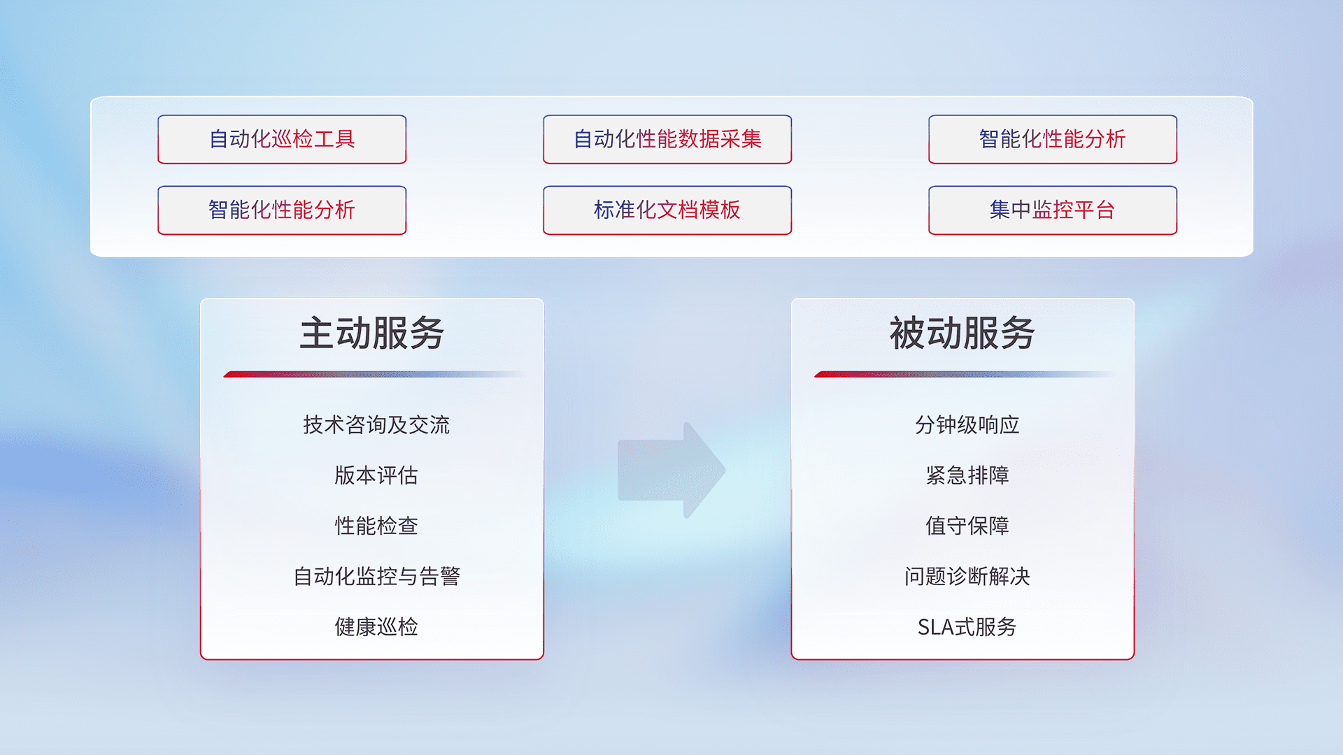 智能化工具和标准化文档,,保障服务质量,,,提供主动服务(包含技术咨询、、、版本评估、、、性能检查、、自动化监控与告警、、健康巡检)和被动服务包含(分钟级响应、、、紧急排障、、值守保障、、、问题诊断解决、、、SLA服务)。。。